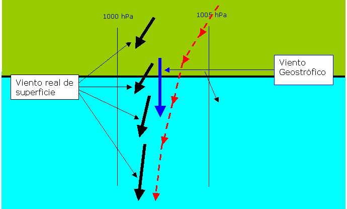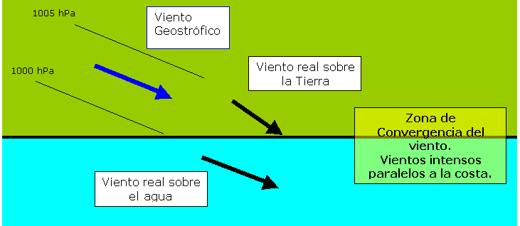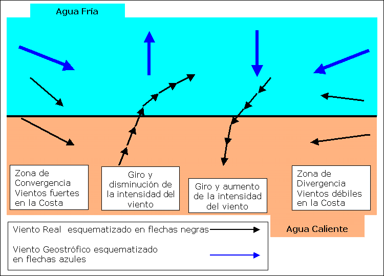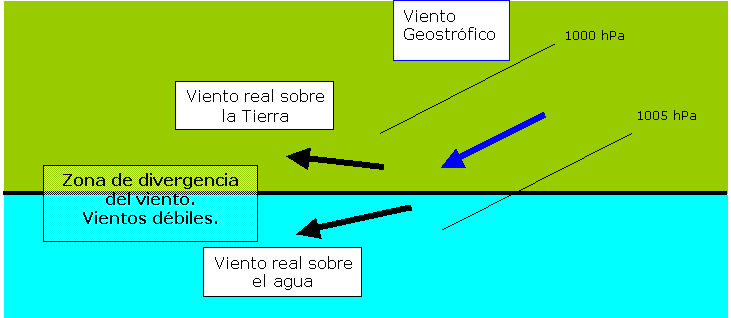 Un cambio abrupto en la temperatura del agua de aproximadamente 4 a 5° C es tan significativo para el viento como la presencia de la costa. Sobre la masa de agua más fría el aire es enfriado desde el suelo y se vuelve más estable, mientras que en el sector donde el agua es caliente el aire se inestabiliza produciendo una mayor mezcla vertical del aire y así disminuyendo la intensidad del viento y generando un menor efecto de la fuerza de fricción. La división entre el agua fría y caliente puede actúa como la costa generando una desviación del viento.