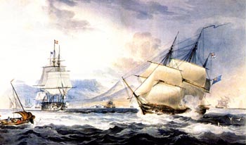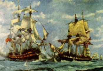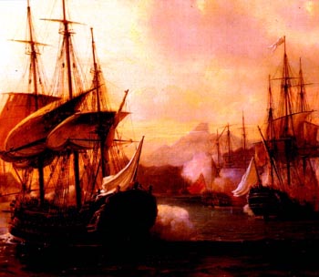 Combate del navío Lyon y la fragata Santa Dorotea. Oleo sobre tela. Autor: E. Biggeri. El cuadro representa la acción entre el navío ingles Lyon y la fragata española Santa Dorotea, en la cual estaba embarcado el 2º teniente del regimiento de Murcia José de San Martín. |