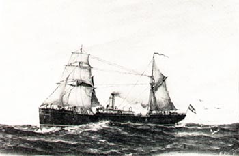 Transporte Villarino acuarela sobre papel. Autor: E. Biggeri. Este buque, adquirido en 1881 y que repatrió los restos mortales del general San Martín, fue usado por la Argentina para establecer la primera línea regular de transporte en nuestras costas patagónicas. Se hundió en 1898, en la bahía Camarones, mientras prestaba estos servicios. |