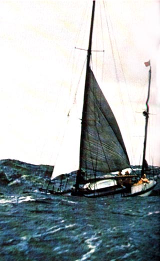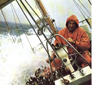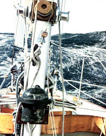 Primer Golpe de Mar: La ola llegó exactamente por la popa, poco después de las 1800, e inundo la bañera. Byars fue arrancado de la barra y arrojado contra la extremidad del tambucho. Burnett cayo por encima de la borda de babor, pero el cabo salvavidas de su cinturón de seguridad aguanto y pudo volver rápidamente a bordo. Ninguno de los dos sufrió heridas. La bañera quedo llena hasta el borde de la brazola, y, como de costumbre, el sistema de autodesagüe se mostró insuficiente. Casi todos los yates padecen el mismo defecto. Una gran olla entro entonces en función. Con ella se vació la bañera, y con la bomba se achico la sentina. En ésta sólo había unos 45 litros de agua.