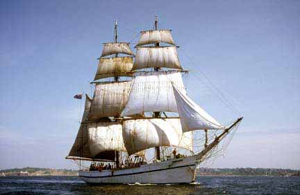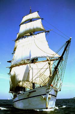 El María Asumpta a toda vela después de 136 años de servicio . Actualmente llevaba una superficie bélica de 700m2 y su aparejo era el de una brickbarca, es decir que lleva en los dos palos velas de vergas y en el palo mayor una cangreja. |