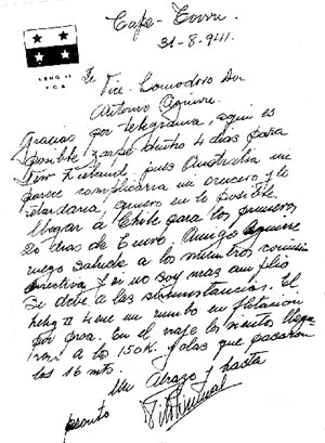 ![]() Carta que le envía Vito Dumas al Vice Comodoro del Yacht Club Argentino Antonio Aguirre, desde Cape Town, en donde le comenta que los vientos superaban los 150 Km. y las olas una altura de 16 mts. |